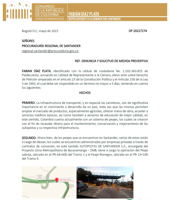 “Es inaudito pues la labor principal de AUTOPISTAS DE SANTANDER S.A. se basa en recaudar las exorbitantes sumas de dinero producto de los peajes, a fin de por lo menos efectuar el mantenimiento de la vía”, se puede leer en la denuncia interpuesta por el congresista Fabian Diaz.