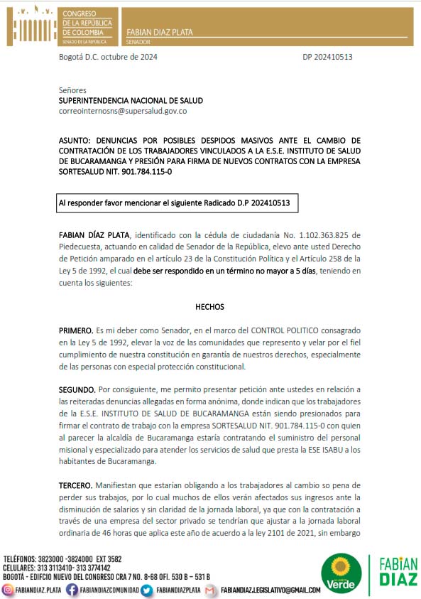 El Senador Fabian Diaz ha presentado una denuncia ante el Ministerio del Trabajo y la Superintendencia Nacional de Salud contra la Alcaldía de Bucaramanga de Jaime Andrés Beltrán señalando presuntas irregularidades en la transferencia de la nómina del Instituto de Salud de Bucaramanga (ISABU) a la cooperativa SORTESALUD. Según el medio de comunicación Desigual, dicha cooperativa estaría vinculada a la familia Alvernia, lo que ha generado preocupación por posibles conflictos de interés y efectos negativos sobre los derechos laborales de los trabajadores.