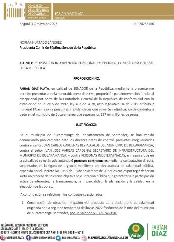 Además, el Senador Diaz solicitó una intervención funcional excepcional la cual fue aprobada en la Comisión Séptima de Senado, con el objetivo que este presunto escándalo de corrupción no sea investigado por la Contraloría Municipal de Bucaramanga tras considerar una posible ausencia de eficiencia o efectividad en las acciones de este ente de control. La intervención funcional excepcional busca que el caso sea asumido por la Contraloría General de la República.