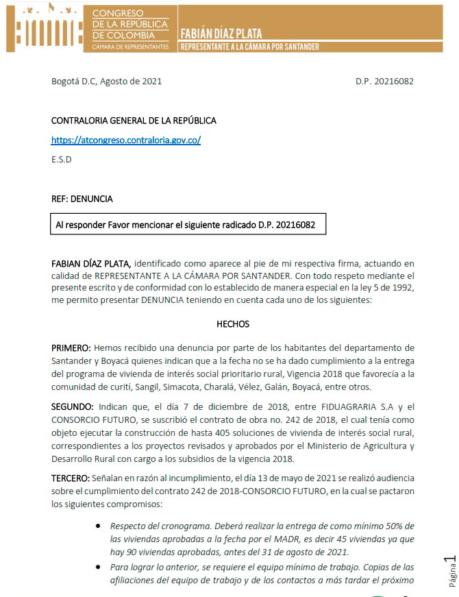 El congresista Fabian Diaz denunció ante la Contraloría irregularidades e incumplimientos en la construcción de viviendas de interés rural en el departamento de Santander y Boyacá por parte del Banco Agrario.