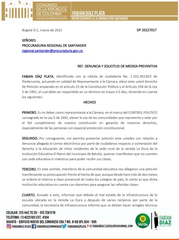 El Senador del Partido Alianza Verde, Fabian Diaz, ante los reclamos de la comunidad del municipio de Betulia, Santander, quienes manifiestan la falta de maestros en la sede rural de la vereda La Dura de la institución Educativa El Ramo, interpuso una demanda ante la Procuraduría Regional de Santander, logrando que el ente de control iniciara una acción preventiva para determinar las posibles irregularidades.