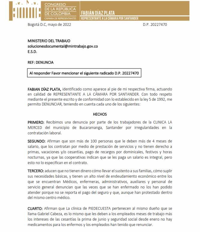 Fabian Diaz logra averiguación preliminar por irregularidades en la contratación laboral de la clínica La Merced