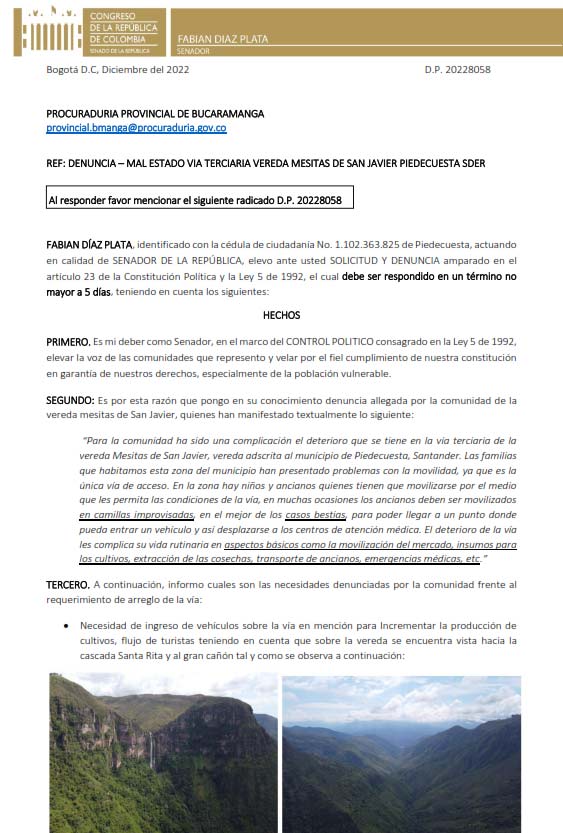 Fabian Diaz logra iniciar acción preventiva por el pésimo estado de la vía terciaria ubicada en la vereda Mesitas de San Javier del Municipio de Piedecuesta.