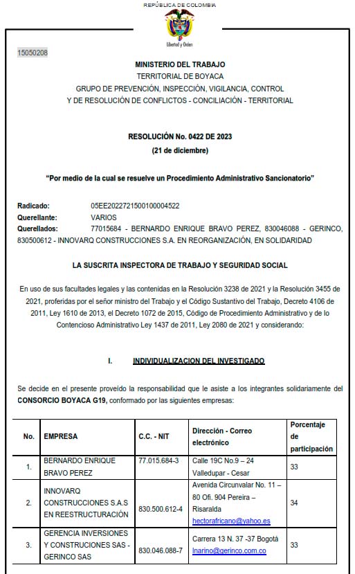 Tras una ardua investigación el ministerio de Trabajo les dio la razón a los empleados del Consorcio Boyacá G19 determinando sanciones monetarias.