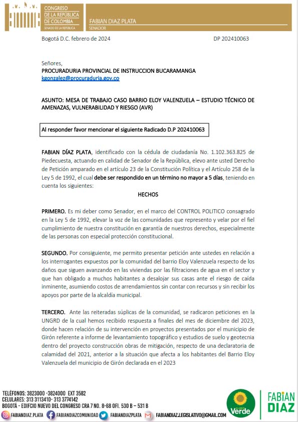 El Senador Fabian Diaz, del Partido Alianza Verde, presentó ante la Procuraduría una petición de carácter urgente sobre las denuncias de la comunidad del Barrio Eloy Valenzuela, en el municipio de Girón, Santander, quienes se enfrentan a una situación alarmante debido a las filtraciones de agua que han deteriorado las viviendas y amenazan con provocar deslizamientos de tierras. Como resultado de los esfuerzos del Senador Fabian Diaz, la Procuraduría ha iniciado una acción preventiva para abordar esta situación