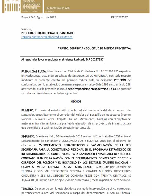 El Senador Fabian Diaz denunció incumplimiento en la pavimentación de una vía del Corredor del Folclor y el Bocadillo en el sector Mal Paso, la vía comunica al municipio de Vélez con el municipio de Chipatá, Santander. Este sector se encontraba incluido en el contrato 2351 de 2014 entre el Departamento de Santander y Consorcio Vías y Equipos 2015 por un valor de $36.624 millones, con un plazo de ejecución de cuarenta meses.