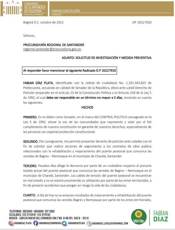 El Senador Fabian Diaz presentó un derecho de petición ante la Procuraduría tras las denuncias de la comunidad por la falta de obras de mantenimiento y prevención del puente peatonal que comunica a las veredas de Bagres – Nemizaquel de Charalá, Santander. El Senador del Partido Alianza Verde logró que el ente de control diera inicio a una acción preventiva.