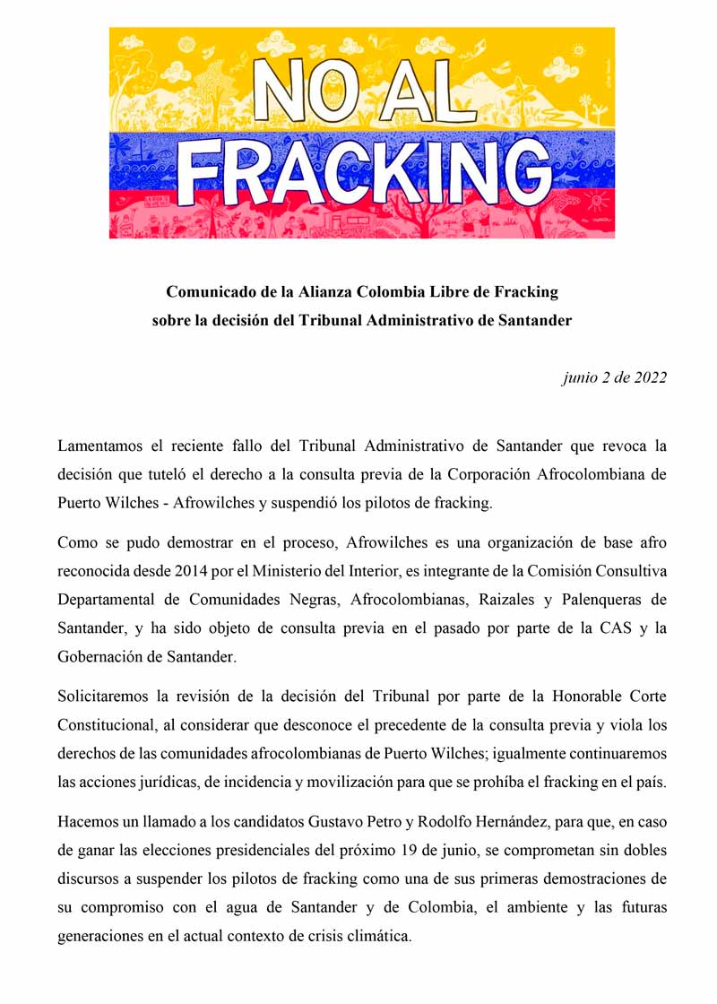 “Hacemos un llamado a los candidatos Gustavo Petro y Rodolfo Hernández, para que, en caso de ganar las elecciones presidenciales del próximo 19 de junio, se comprometan sin dobles discursos a suspender los pilotos de fracking como una de sus primeras demostraciones de su compromiso con el agua de Santander y de Colombia, el ambiente y las futuras generaciones en el actual contexto de crisis climática”, informa el comunicado de la Alianza Colombia Libre de Fracking.