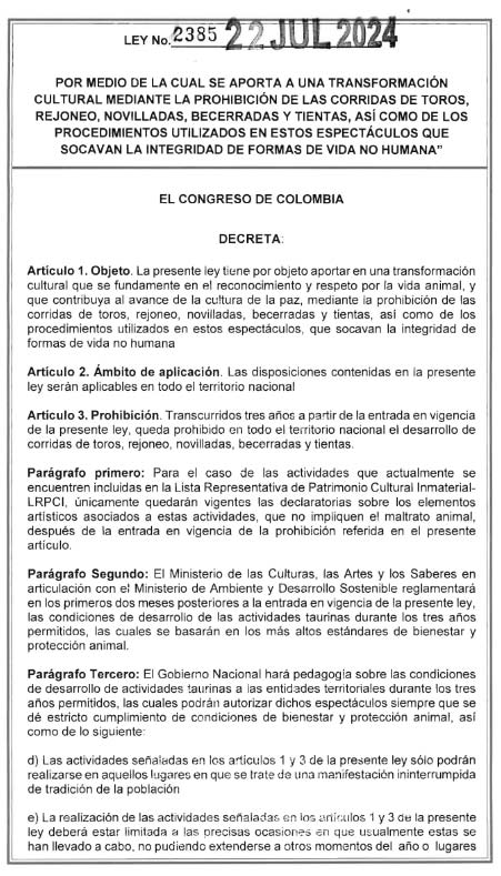 Esta ley, coautoría del Senador Fabian Diaz, representa un hito en la lucha de más de 30 años llevada a cabo por organizaciones de protección animal. En un paso histórico para la protección animal y la transformación cultural en Colombia, el Gobierno ha sancionado la Ley ‘No más Olé’, una iniciativa que prohíbe el desarrollo de corridas de toros, rejoneo, novilladas, becerradas y tientas en todo el territorio nacional.