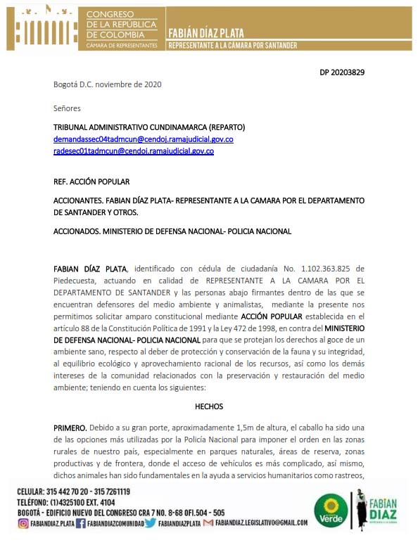 Procuraduría respalda acción popular del Senador Fabian Diaz que busca prohibir el uso de Caballos durante las manifestaciones