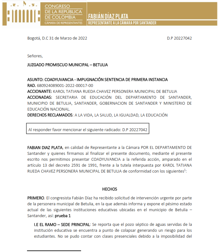El congresista Fabian Diaz se adhirió a la tutela interpuesta por Karol Rueda, personera municipal de Betulia, Santander, frente a las denuncias de cientos de padres de familia campesinos que durante varios años han solicitado la reparación de las pésimas infraestructuras de las sedes educativas de El Ramo y Nuestra Señora de la Paz que cuentan con 493 estudiantes.